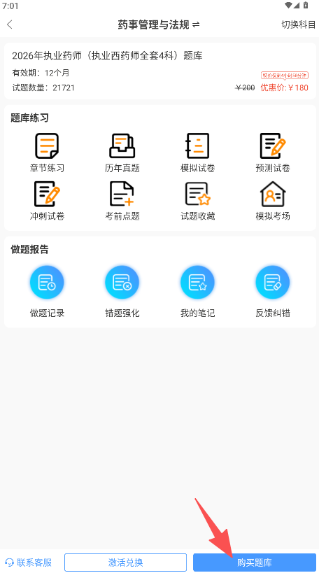 1、考试添加与题库管理,在首页选择并添加目标考试后,可在学习页面找到对应题库进行激活或购买使用。