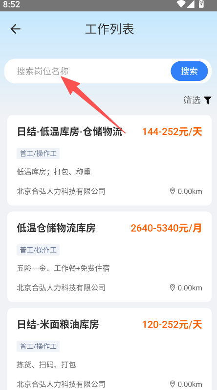 1、提供岗位搜索功能,进入工作列表页面在搜索框输入名称,点击搜索查找对应的零工岗位。