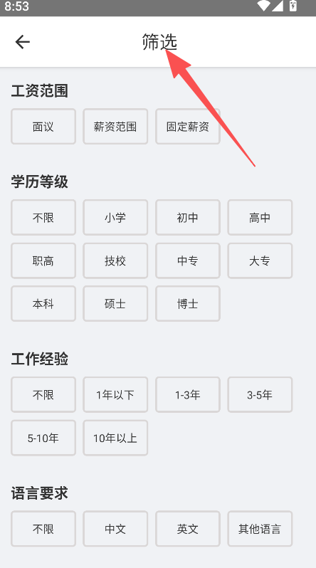 2、点击筛选选项,选择工资范围、学历等级等条件完成筛选。