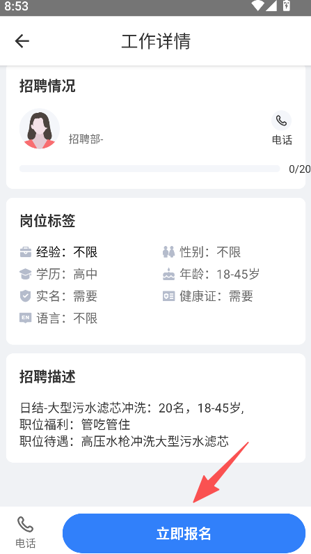 3、报名操作便捷,工作详情页直接设立即报名按钮,快速推进零工岗位的报名流程。