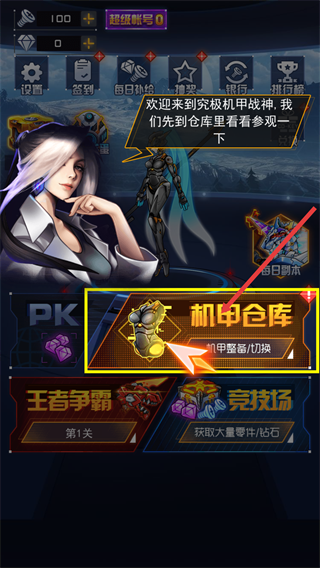 1、在游戏界面,点击【机甲仓库-机甲整备/切换】按钮。