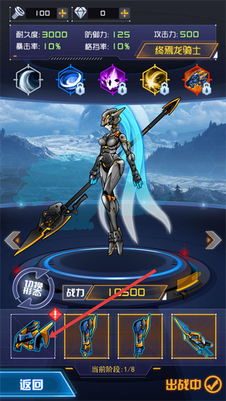 2、进入机甲仓库界面,点击【终焉龙骑士】机甲下方的部件。