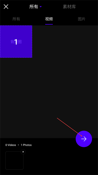 2、在素材选择页选择目标素材(如“背景图”),选中后点击右下角箭头按钮。