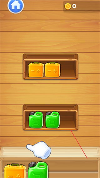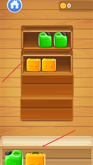 2、按界面指引将【绿色油壶】放到对应货架层,把同类型物品归置到同一区域,完成初步的物品整理操作。