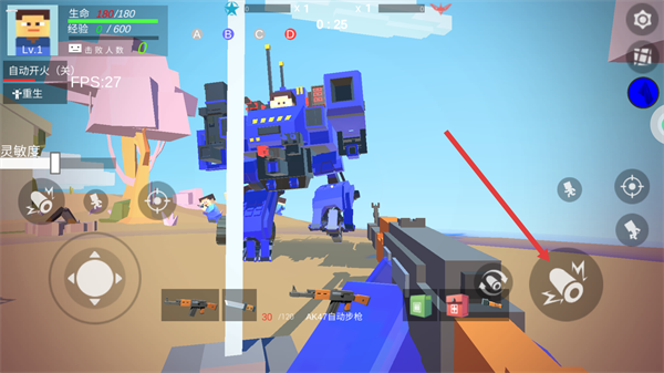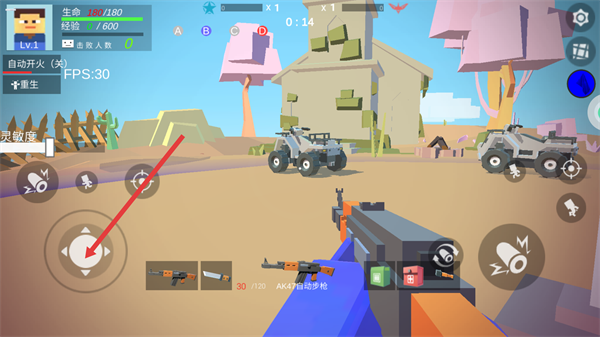 3、在游戏对局界面,通过左侧移动控件操控角色移动,可切换【AK47自动步枪】等武器,利用界面功能进行战斗操作。