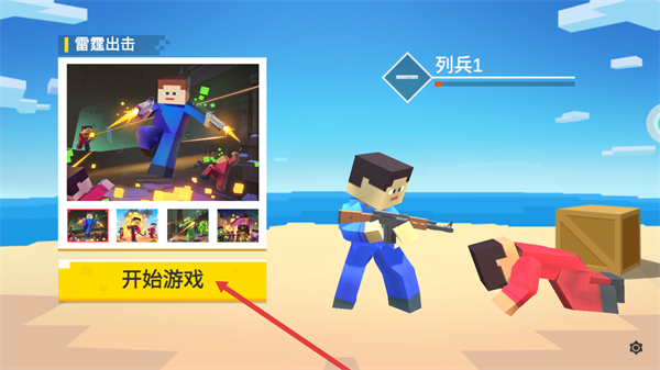 1、在显示【雷霆出击】的界面,可查看当前等级为【列兵1】,点击【开始游戏】按钮即可进入游戏流程。