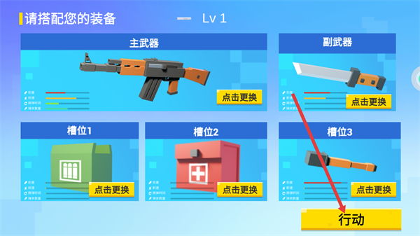 2、进入【请搭配您的装备】界面,可通过【点击更换】调整【主武器】【副武器】及各槽位道具,配置后点击【行动】进入对局。