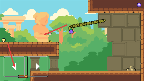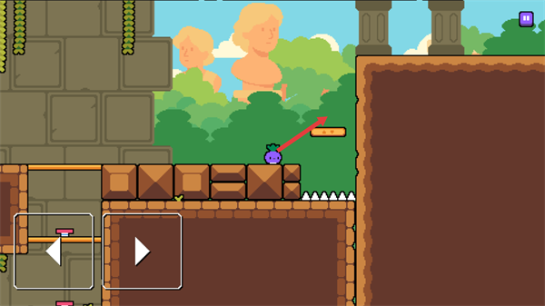 3、在关卡中,通过界面的方向及移动按钮操控紫色角色移动,需避开尖刺类障碍,向目标区域推进。
