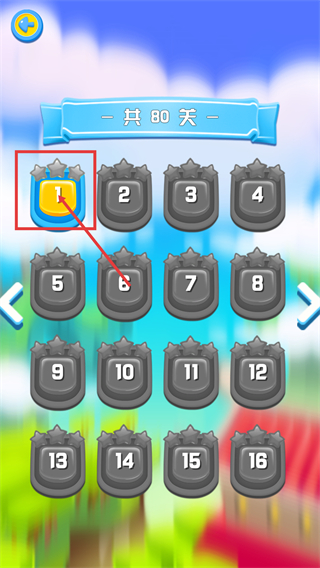 1、游戏共设【80关】,点击已解锁的【1】号关卡图标,即可进入对应关卡开始挑战。