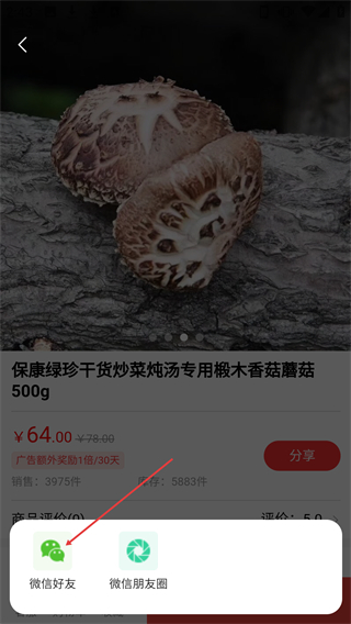 3、在商品详情页,点击【分享】按钮可弹出分享选项弹窗。