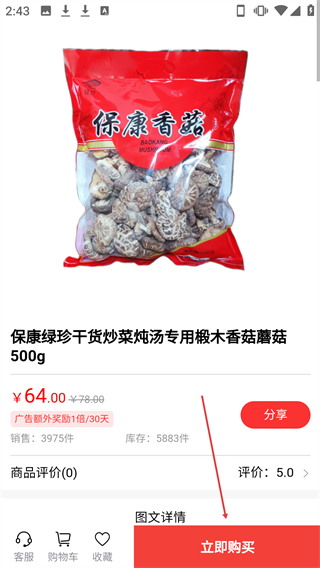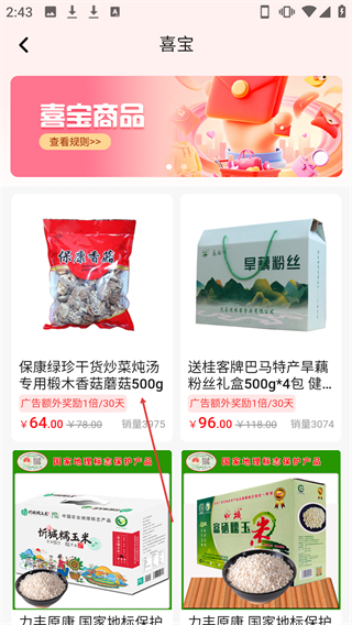 2、在【喜宝】商品页面,点击【保康绿珍干货炒菜炖汤专用椴木香菇蘑菇500g】商品条目可进入商品详情页。