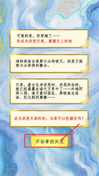 1、了解剧情背景:你穿越成【洪荒天道】掌无上权柄,需应对鸿蒙道祖算计、洪荒各族整合等危机,点击【开始掌控洪荒】进入游戏。