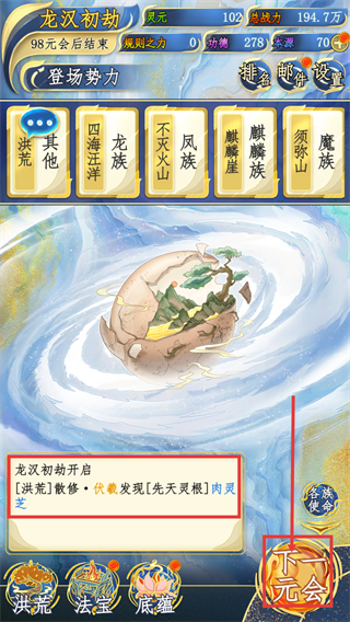 2、【龙汉初劫】开启后,选择【登场势力】,同时可触发【讲完散修】-【发现先天灵根】等事件,推进玩法进程。