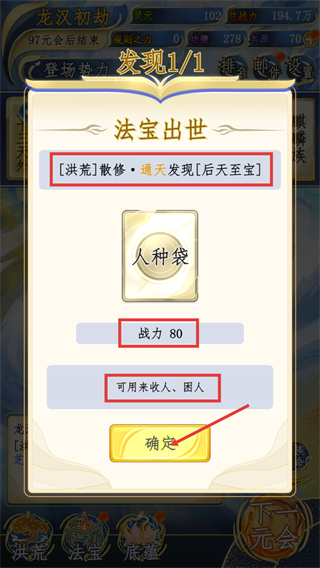 3、完成事件后会触发【法宝出世】,【洪荒】散修可发现【后天至宝】-【人种袋】,其加【战力-80】且可收人-困人,点击确定领取。