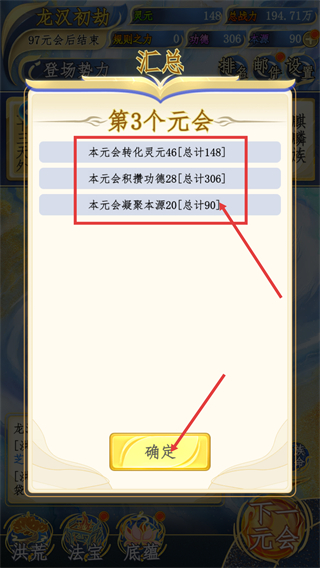 4、在【第3个元会】界面,可查看本元转化-积累-凝聚的资源数值,确认后点击确定,推进元会进程。