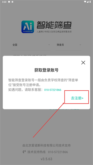 2、在登录页面,点击【获取登录账号,去注册】选项,进入账号注册的引导弹窗。