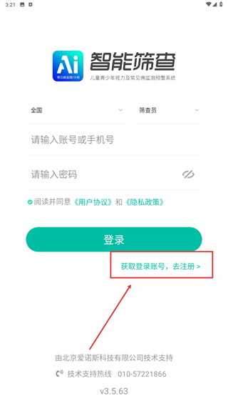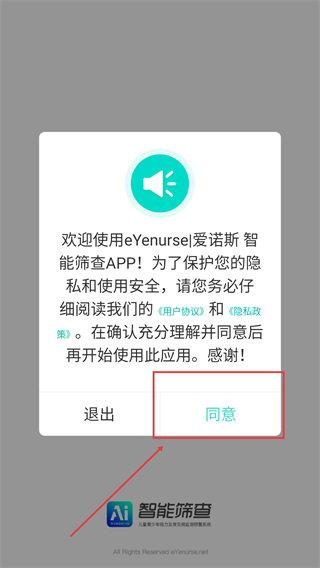1、在智能筛查APP启动页,点击【同意】按钮,确认用户协议与隐私政策以进入登录界面。