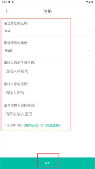 4、在注册页,选择区域、角色,填写手机号、密码等信息,并勾选协议后,点击【提交】完成账号注册。