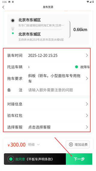 4、在发布货源页,确认装车时间、托运车辆等信息,勾选协议后点击【下一步】,完成拖车订单的发布流程。