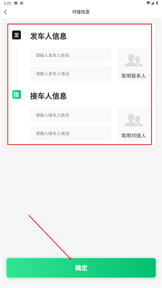 3、在对接信息页,填写发车人、接车人的姓名与电话后,点击【确定】按钮,进入发布货源的信息确认界面。