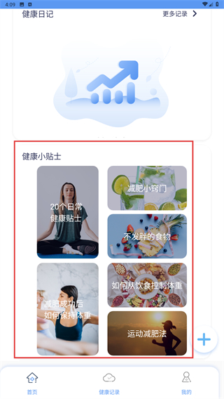 3、在首页下方的“健康小贴士”板块,可浏览健康相关的科普内容(如减肥方法、饮食建议)。