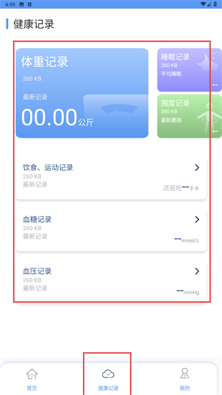 4、点击底部【健康记录】选项,进入健康记录页面,可查看体重、睡眠、饮食等分类的详细记录数据。