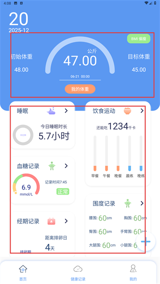 2、在首页可查看体重、睡眠、血糖等健康数据概览,也能通过对应模块(如“我的体重”)查看详细记录。