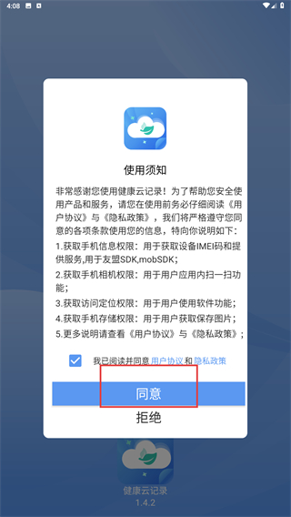 1、在“健康云记录”启动的使用须知,勾选协议后点击【同意】按钮,进入应用首页。