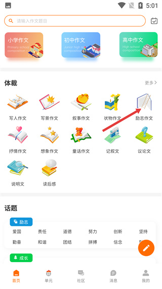 1、进入APP首页,点击【励志作文】能筛选对应体裁的作文内容。