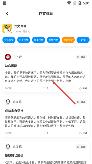 2、进入【励志作文】体裁页面,会展示对应作文列表,包含作文标题、作者及字数、互动数据等信息,可选择作文查看。