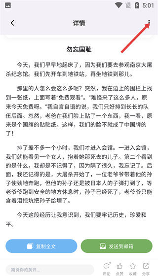 3、进入作文详情页能查看完整内容,点击右上角三点按钮可展开更多功能。