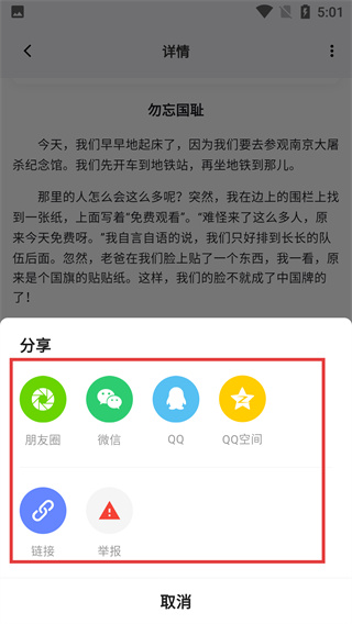 4、点击详情页右上角三点,弹出分享菜单,可通过【朋友圈】、【微信】等渠道分享作文。