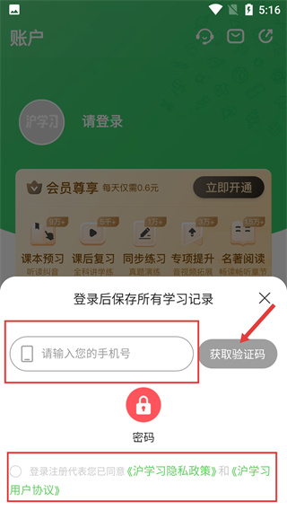 2、点击【请登录】后弹出登录框,需在【请输入您的手机号】栏填号码,同时要同意【沪学习隐私政策】、【用户协议】。