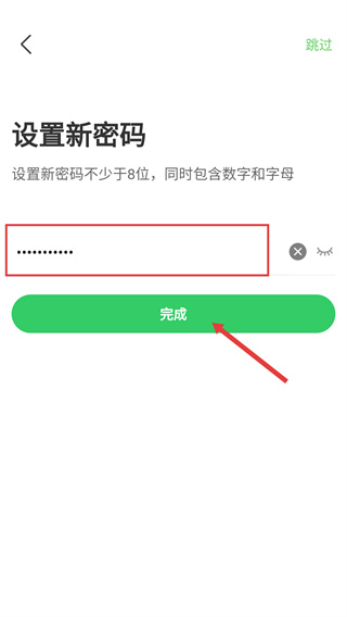 4、进入【设置新密码】页,填写符合要求的密码后,点击【完成】按钮完成密码设置,即可完成账号的注册登录操作。