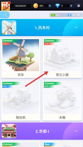 1、进入关卡选择界面,选定【1-风车村】关卡,点击对应模型(如【荷兰小屋】),进入该模型的拼接流程。