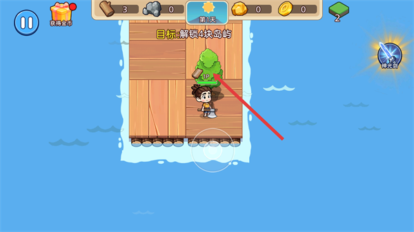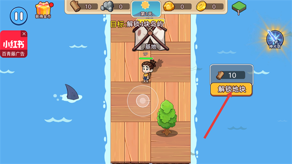 3、进入游戏后,在【第1天】界面,消耗【10】木材点击【解锁地块】,推进【解锁4块岛屿】的目标。