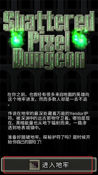 1、点击【进入地牢】按钮开启冒险,探索【Shattered-Pixel-Dungeon】的随机地牢,挑战未知的敌人与陷阱。