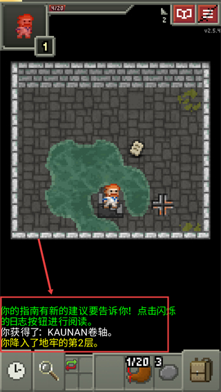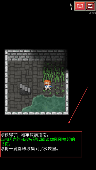 1、获取【地牢探索指南】后,点击【闪光的日志按钮】阅读书页,收集露珠到【水袋】,为后续冒险做准备。