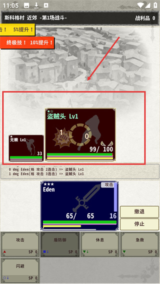 2、战斗中观察【盗贼头-Lv1】【无赖-Lv1】的HP条,操控【Eden】选择攻击指令进行战斗。