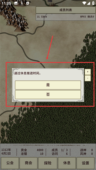 4、在地图界面点击休息,通过选择是来推进时间,可用于恢复状态或触发新事件。