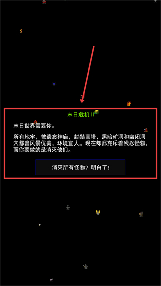 1、进入【末日危机II】游戏界面,点击【消灭所有怪物?明白了!】按钮,开启冒险前的剧情确认流程,正式进入游戏。