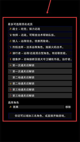 3、在角色选择界面,可选取【战士】-【牧师】-【猎人】-【烈焰法师】等职业,组建最多四名成员的冒险队伍。