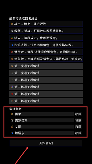 4、选满四名角色后,点击界面底部的【开始冒险!】按钮,正式开启地牢像素风格的放置冒险之旅。
