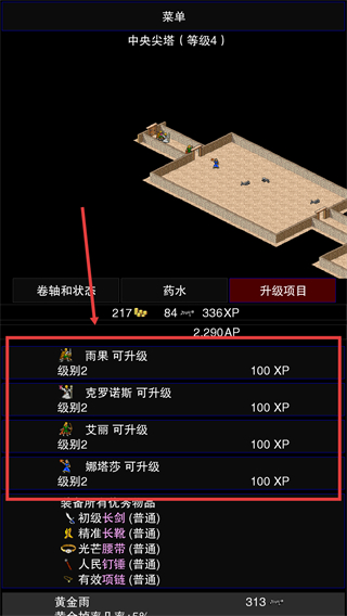2、积累【XP】和【AP】后优先升级角色等级,解锁新能力,装备【初级长剑】等物品增强战力。