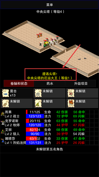 3、遭遇头领【厄运大王】前确保角色等级提升,合理分配技能点,用卷轴增益提升战斗胜率。