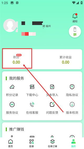 2、进入盒聚变个人中心,能查看账户积分及累计收益,还可使用积分记录、文本导入等多项服务功能。
