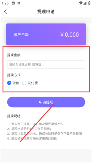 4、进入盒聚变提现申请页面,输入提现金额并选择微信或支付宝作为提现方式,即可提交申请。