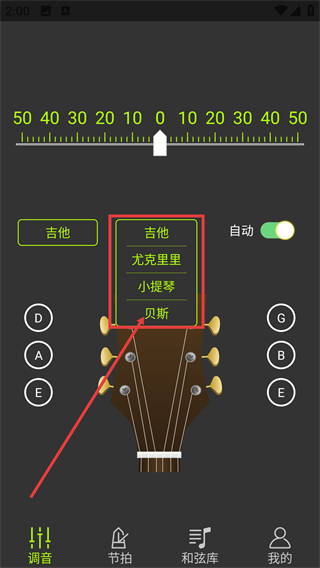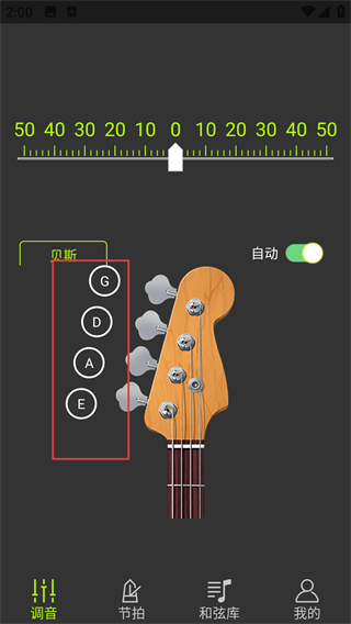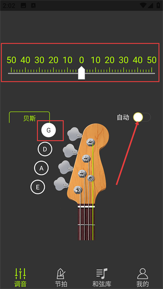4、在贝斯调音界面,点击右侧的【自动】开关并开启,即可启用自动调音功能,配合【G】弦等标识提升调音效率。
