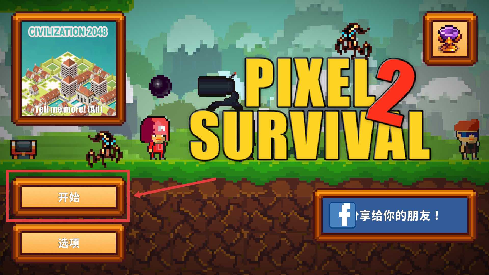 2、进入【PIXEL2-SURVIVAL】游戏界面,点击【开始】按钮即可开启像素风格的生存冒险之旅,准备探索世界收集材料。