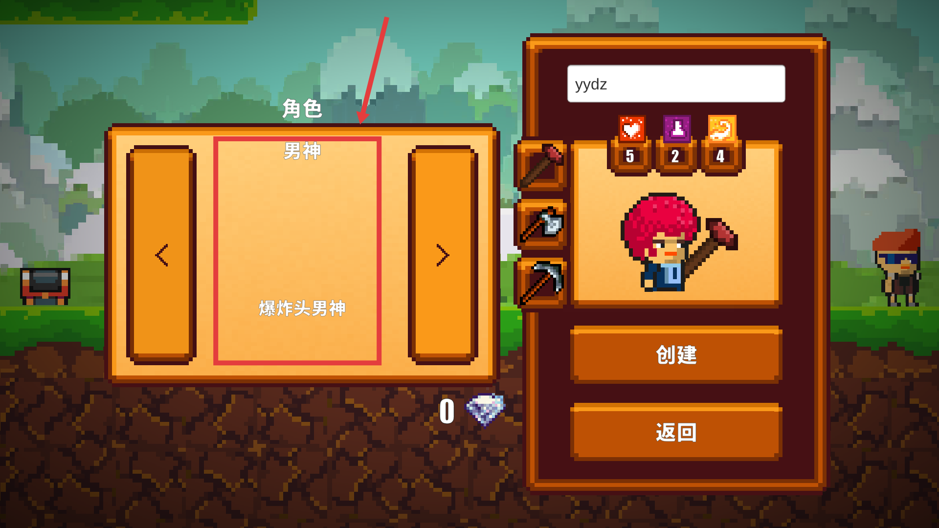 3、在角色选择界面选定【男神】角色,点击【创建】按钮生成角色,即可携带初始工具进入生存场景开始挑战。